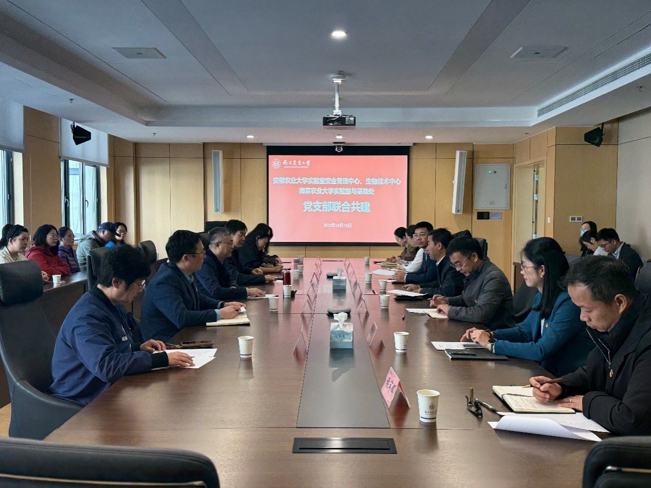 2025年10月24日,安徽农业大学实验室安全管理中心、生物技术中心一行来校调研交流,并与我处开展支部联合共建。安徽农业大学调研组由实验室安全管理中心、生物技术中心主任王涛带队,正处级组织员汪勇、副主任冯继明及相关科室同行。校实验室与基地处党支部书记胡健、支委张清海、马洪雨及相关科室党员参加。会议由胡健主持。