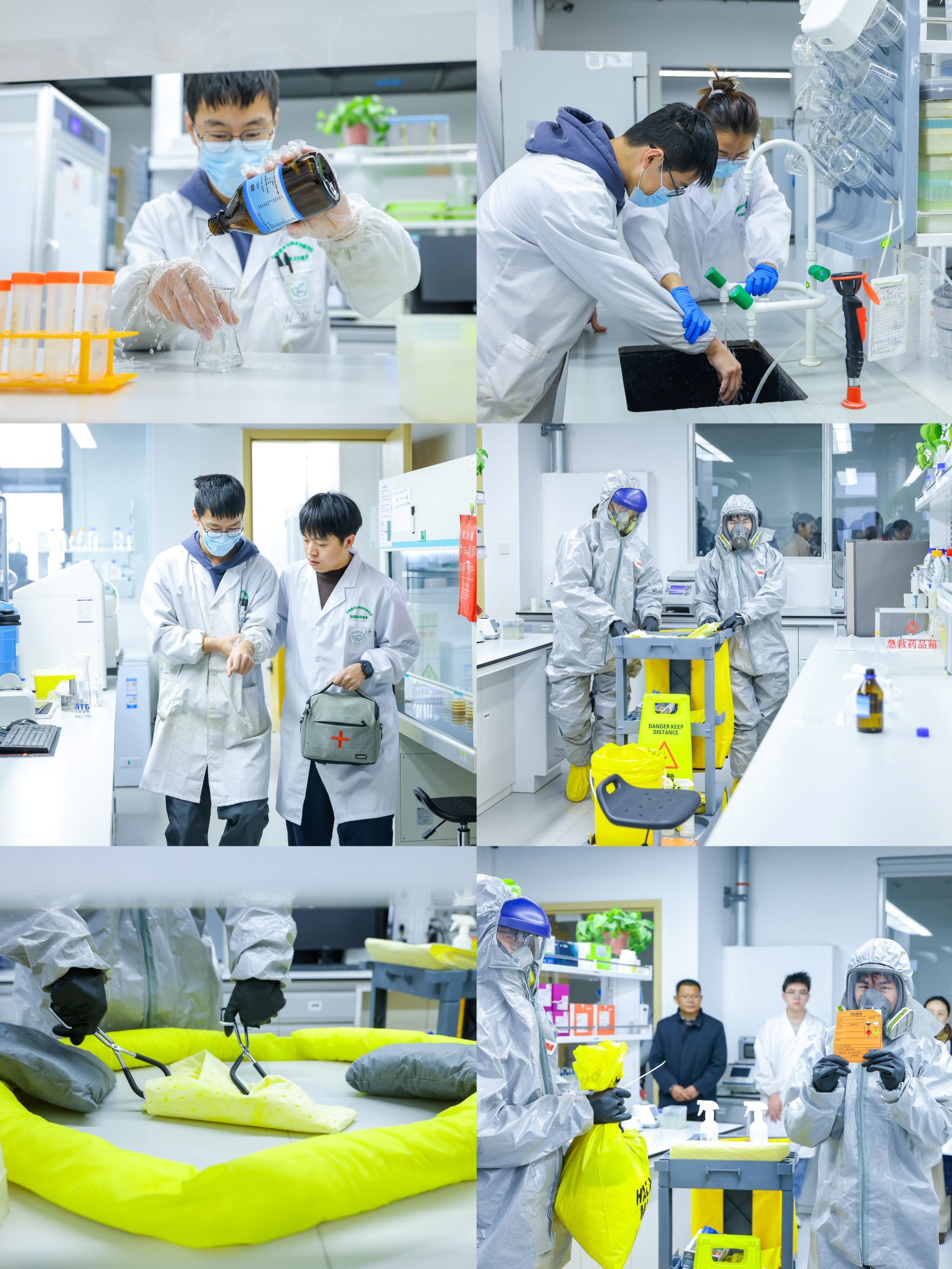 演练模拟场景为实验人员操作时打翻硫酸试剂瓶引发泄漏。事故发生后,现场人员立即启动应急响应程序;受伤人员紧急冲洗,同伴联系校医及实验室负责人;安全负责人组织人员疏散,做好现场警戒与通风并上报险情。应急处置小组穿戴好防护装备并测试密合性后进入现场,通过围堵、吸附、中和等规范流程完成泄漏处置,废弃物均按要求密封贴标。