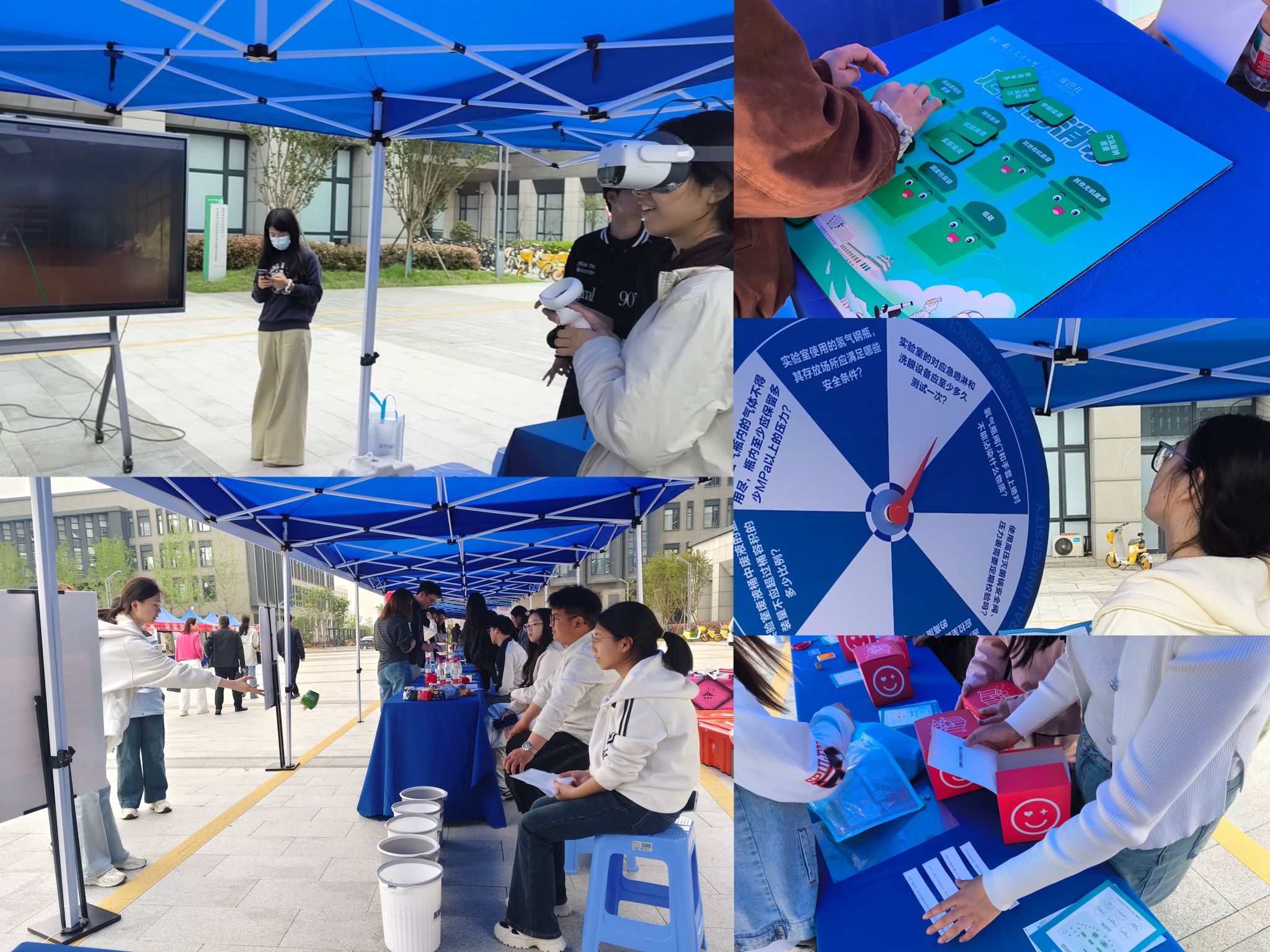 现场氛围热烈,以“寓教于乐”为核心设置五项趣味闯关环节,师生持集章卡踊跃参与,在轻松氛围中学习安全知识,通关可兑换礼品,有效调动参与积极性。VR虚拟情景演练让师生在零风险环境中沉浸式模拟消防逃生、烧烫伤处置等场景;应急处置情景模拟结合校园真实案例设置场景盲盒,限时排序处置流程,提升师生突发状况应对能力;实验室安全小“转”家、危化品分类投掷赛、危废消消乐环节,分别通过抽题问答、趣味投掷、游戏化学习,强化师生安全素养、危化品分类认知和危废规范处置能力。