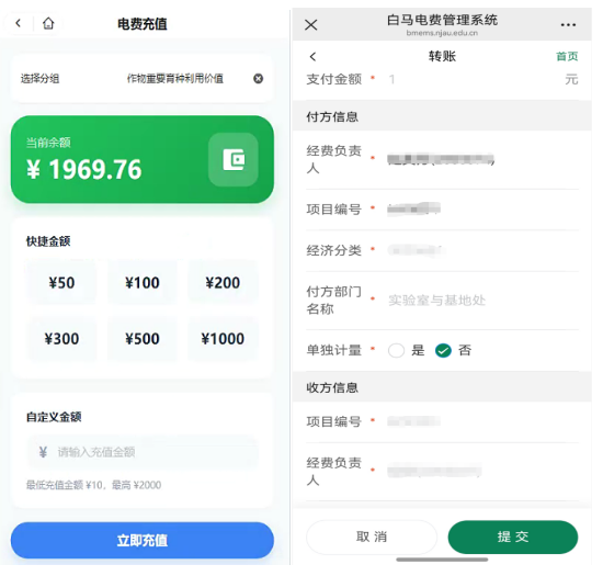 为进一步提升基地管理信息化水平,方便师生实时查询所租借房间的电费余额、用电明细,并实现在线便捷充值,白马电费管理系统将于4 月 8 日正式上线。现将系统用户服务指南简版公布如下: