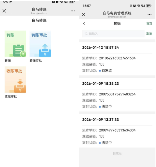 支持查询本人转账申请记录;经费负责人可在线审批转账,收方负责人可在线完成收账审批。